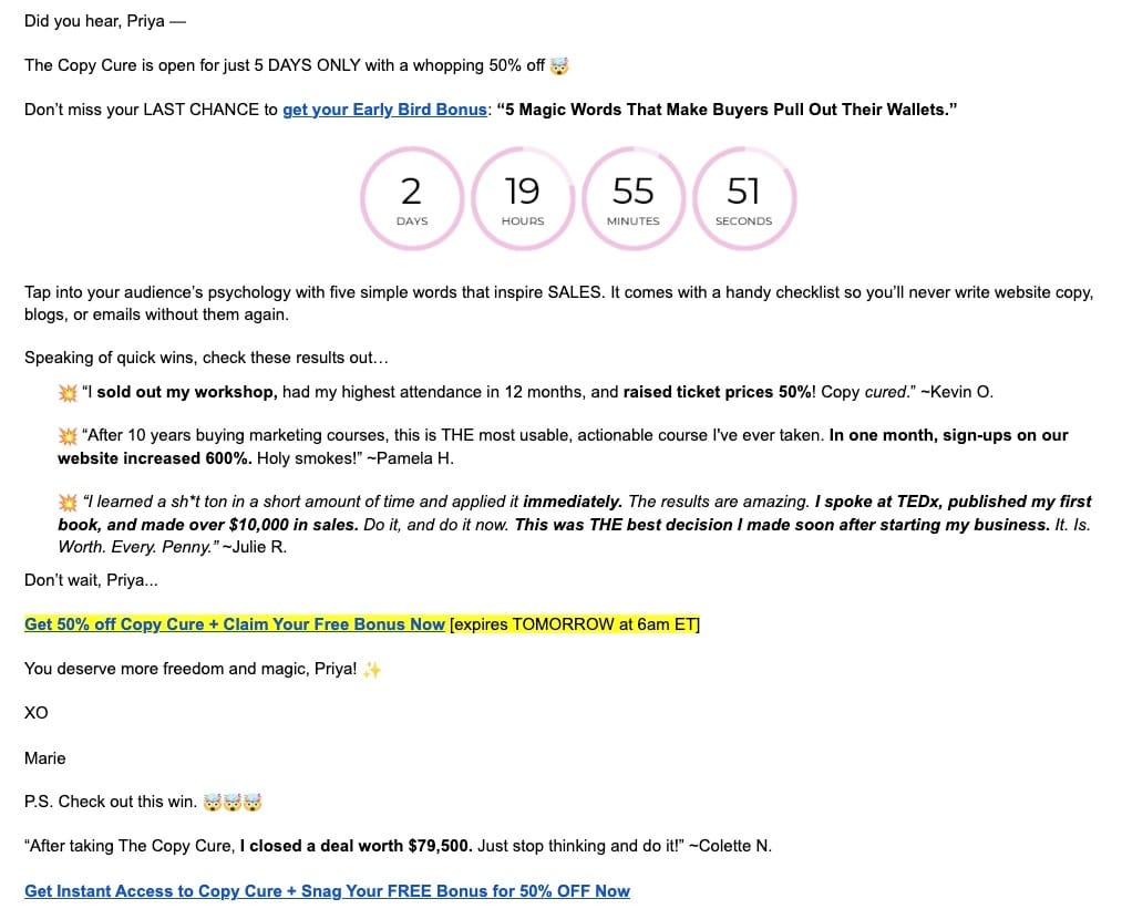 This email is a sales pitch for "The Copy Cure" course, offering 50% off for 5 days only.