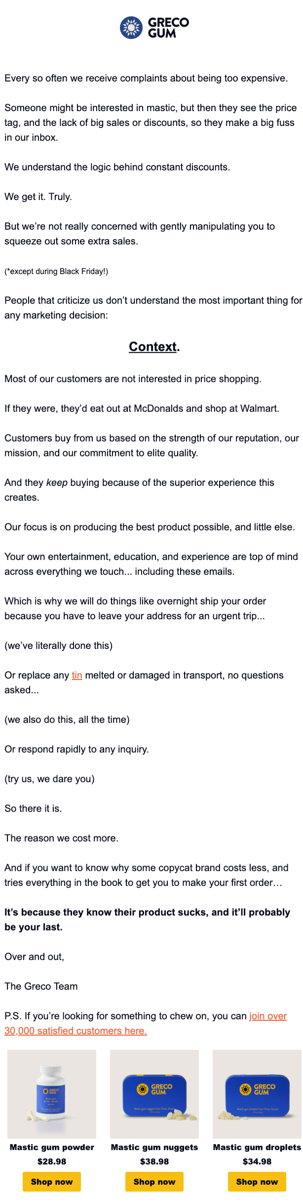 This is an email from Greco Gum addressing customer complaints about price and lack of discounts. It’s a brand values and positioning email — reaffirming their premium stance, defending pricing, and reinforcing trust and loyalty among quality-conscious buyers.