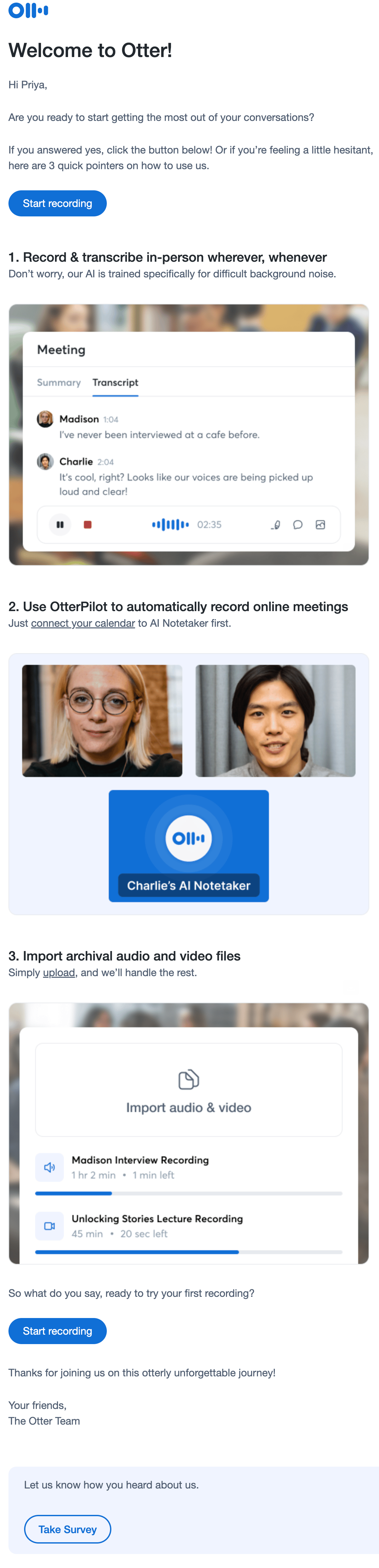 This email is from Otter. It's a welcome email that activates new users by showing them three ways to start using the product.
