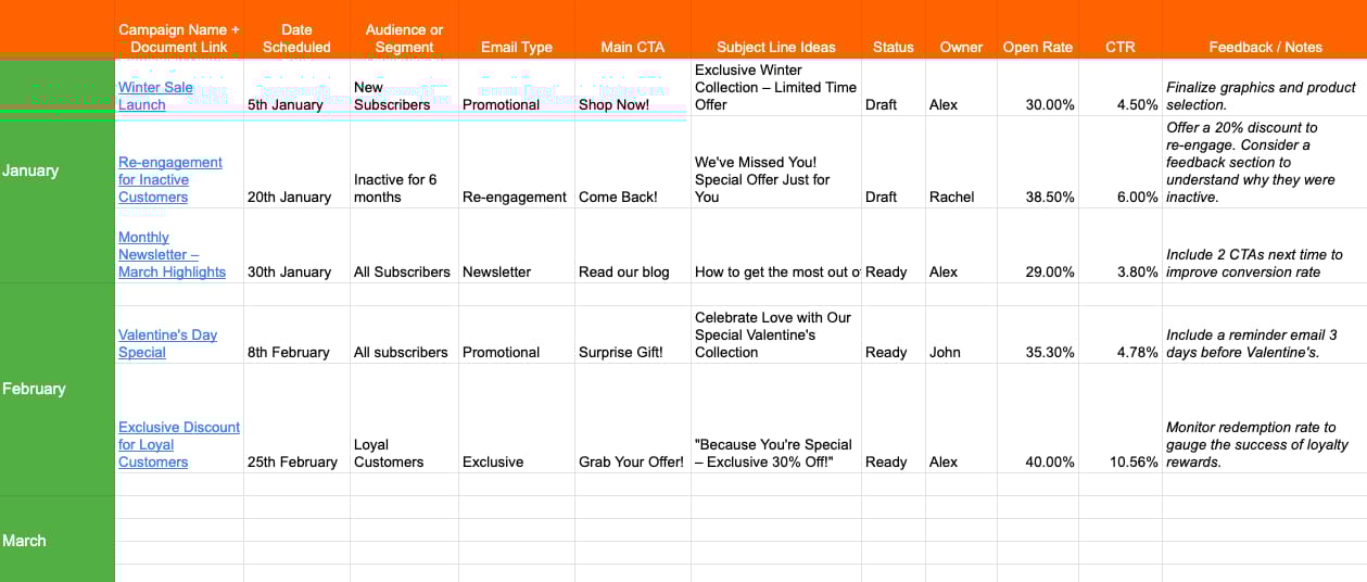 Lay out your product launches, holiday promotions, events/partnerships, newsletters, and re-engagement emails first, then find creative ways to fill in any gaps.